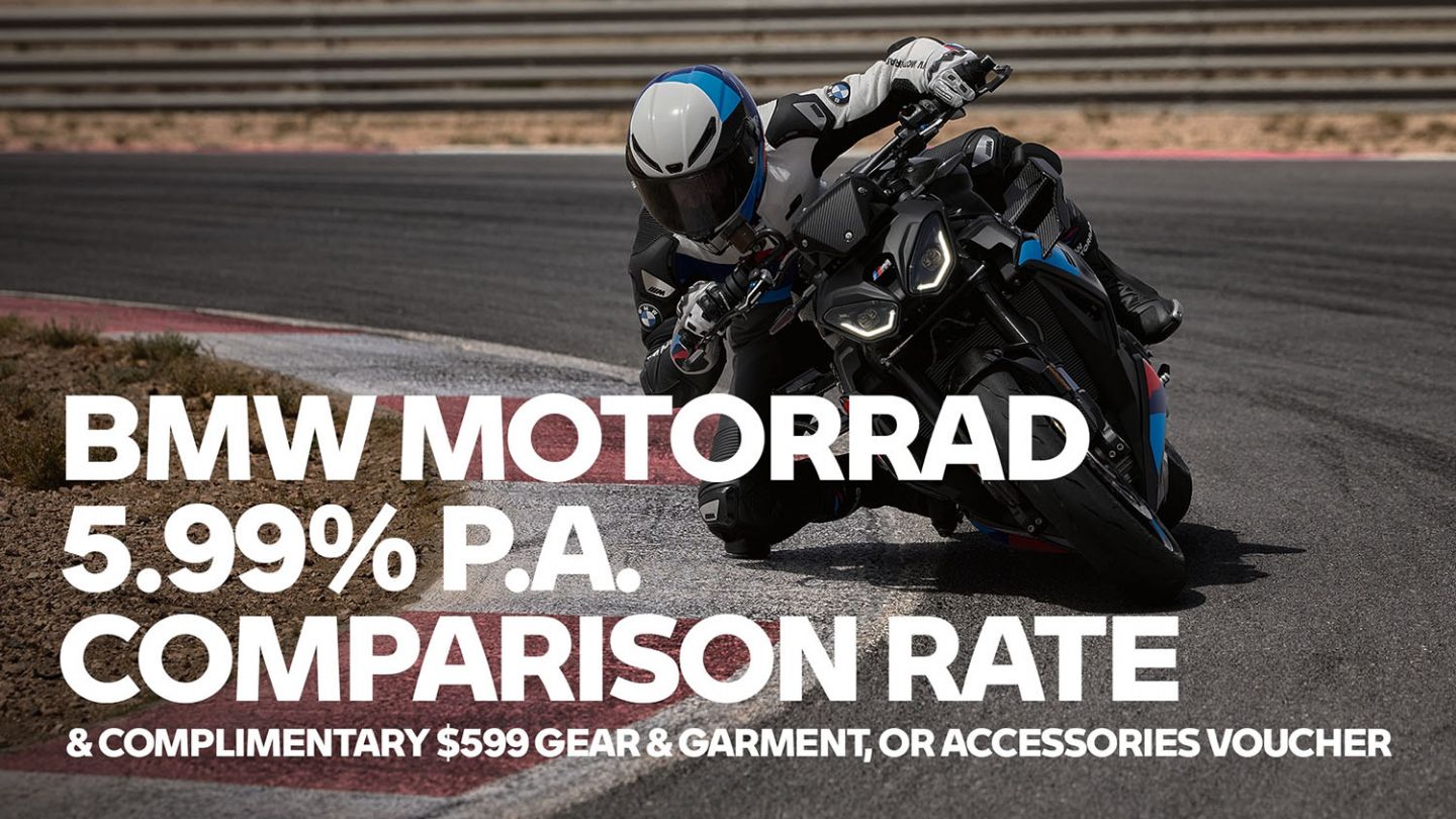 Ride off into new adventures with a competitive 5.99%p.a. comparison rate and a complimentary $599 Gear, Garment and Accessories Voucher across all new and demonstrator BMW Motorrad models with BMW Finance.